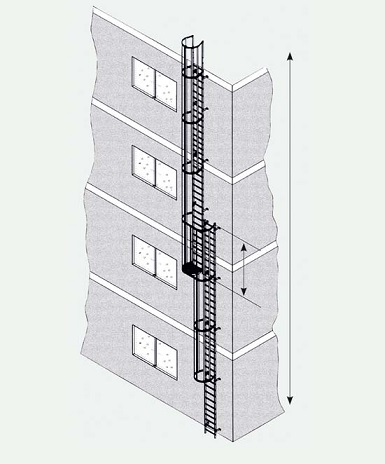 Ab einer bestimmten Gebäudehöhe (bei Maschinenaufstiegen und Notleitern gelten teilweise abweichende Bestimmungen) sind Steigleitern mit Rückenschutz auszuführen. Ein Leiterzug darf nicht mehr als 10 m Steighöhe haben (bei Maschienenaufstiegen und Notleitern gelten abweichende Bestimmungen), d.h. ab einer Gebäudehöhe von 10 m sind Steigleitern in versetzter Ausführung anzubringen (DIN 18799-1). Ist dies nicht möglich, muss in dem Leiterzug mind. alle 10 m ein klappbares Podest vorgesehen sein. Außerdem Bedarf es dann unbedingt einer Genehmigung der örtlichen Behörden. Grundsätzlich entscheiden die zuständigen Behörden (Brandschutzbehörde etc.) vor Ort über die Art der Ausführung und Genehmigung. Normen und Vorschriften können sich ändern. Haftungsausschluss: Alle Angaben ohne Gewähr.